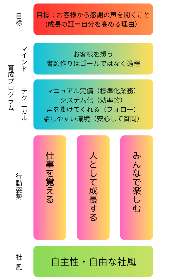 私たちの目標は創業当時から一貫して「お客様の感謝の声をいただくこと」。目標を達成するため自主性を重んじる土壌の上に、スタッフに求める3つの柱があり、それを支える教育環境があります。